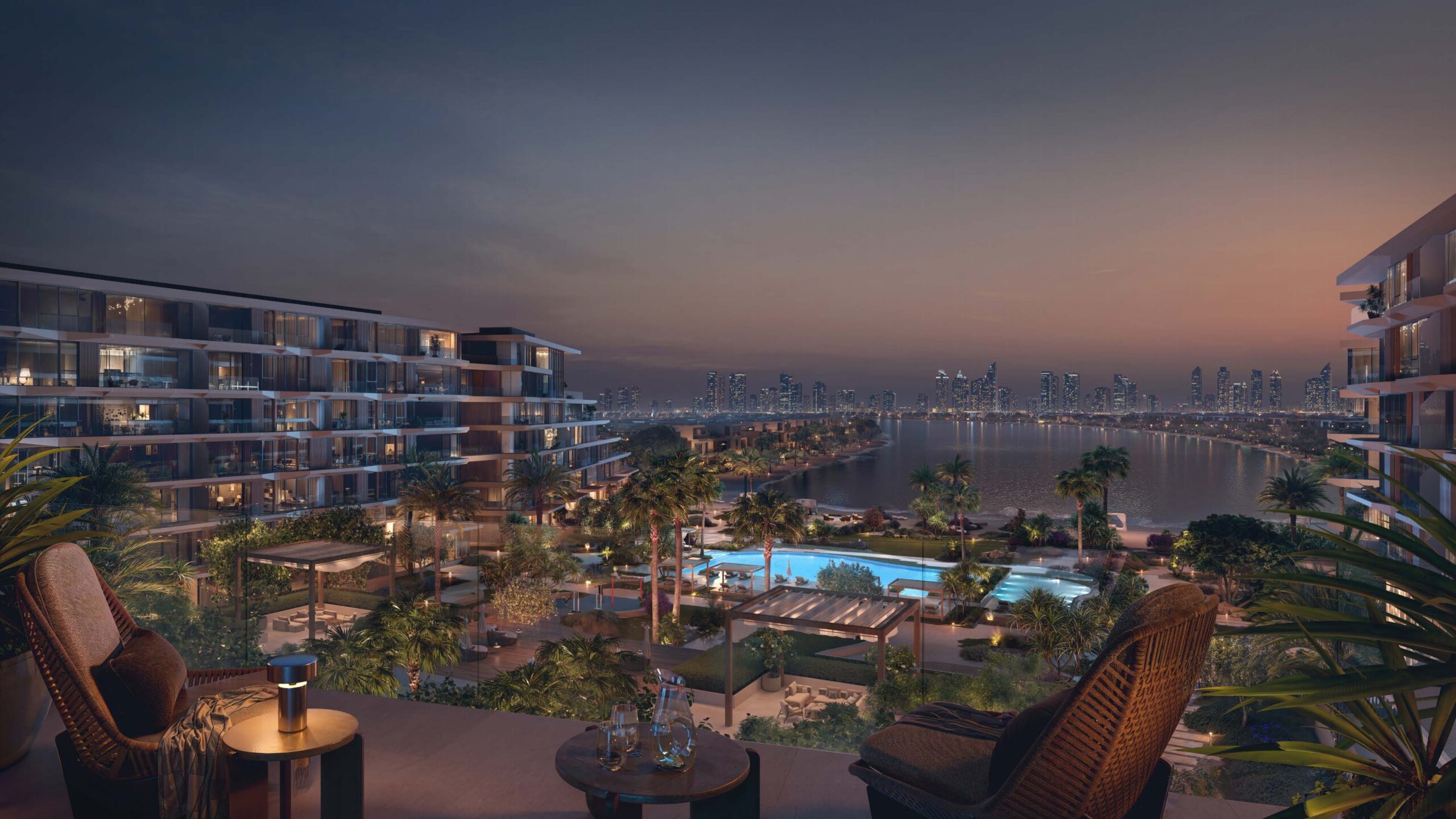 Floor-to-ceiling glazing fills each residence with natural light and sweeping sea and skyline views, blurring the boundary between interior comfort and the beauty of resort living. By night, the softly illuminated façade reflects across the water, revealing a graceful form that blends with its coastal setting.